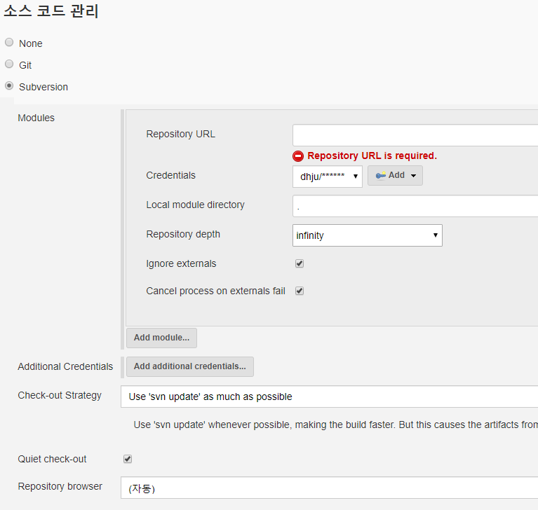 Credentials : Add 버튼을 클릭하여 실제 svn에 접속이 가능한 svn 계정과 비밀번호 입력